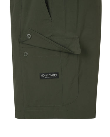 - Cargo shorts with outdoor-style cargo-type outer pockets and cut-out line design