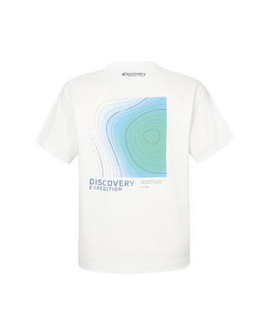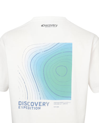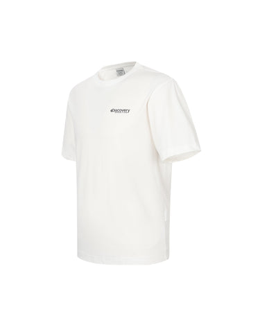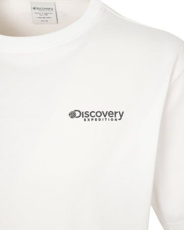 - Short-sleeved T-shirt with the Discovery logo on the chest and the box contour and lettering graphic using the crack technique on the back as points